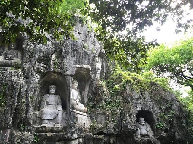 飞来峰位于杭州灵隐寺的前面,据说是从四川峨眉山飞来的,被疯和尚济公给镇住了才一直留在了灵隐寺的前面再没飞走。