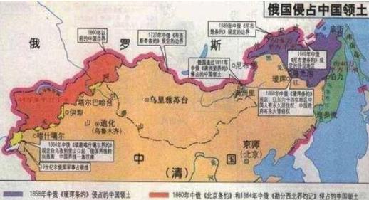1850年到1860年,正是在清朝平定太平天国运动期间和第2次鸦片战争期间。位居我国北方的沙皇俄国,采用军事威胁和政治讹诈等手段,通过《中俄瑷珲条约》和《中俄北京条约》,接连割占了中国黑龙江以北、乌苏里江以东高达107万平方公里的肥沃土地。这也是中国第1次失去如此庞大的国土,这部分国土占据了中国国土总面积的1/10之强。
