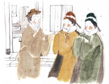 宋朝时,有游酢、扬时两人跟着程颐老夫子学习,他们对老师非常的恭敬。在冬季的某一天,这两位学生陪着老师,并听老师教诲。说了一会儿,夫子便闭目养神,不知不觉地睡着了。他们两个不敢离开,又怕吵醒夫子,就静静地站在两旁等夫子醒来。夫子醒来见他们两位还站在旁边,便说了:“你们还没走啊!”他们两个回答:“我们是因为先生睡着了,没有请命,不敢离去!”于是再把书中有疑问的地方请教夫子,最后才向夫子拜辞。出门的时候他们才发现雪已经积了三尺深了。这两位学生,后来也都成为很有名的人。