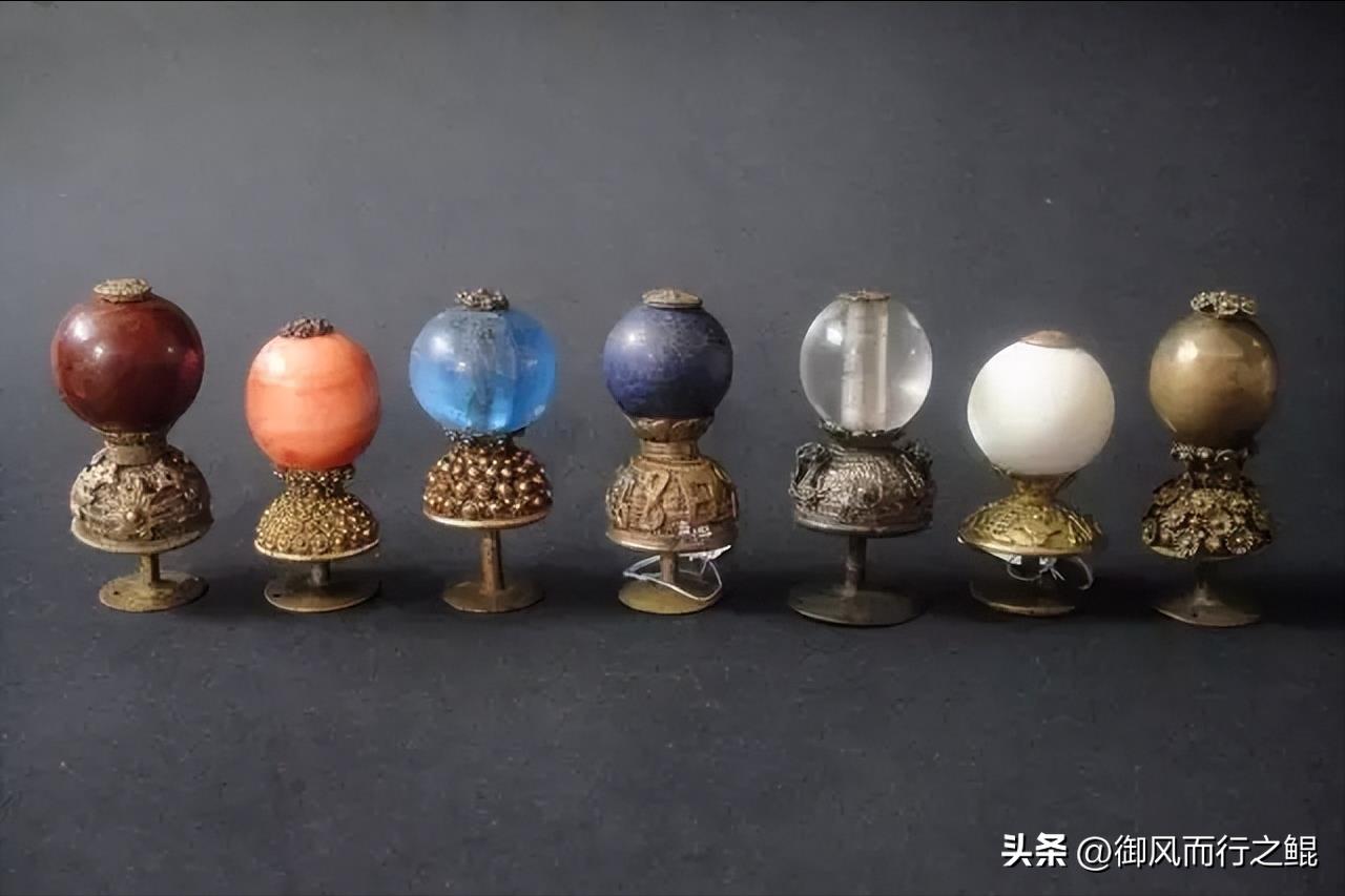 四品为青金石及蓝色涅玻璃,五品为水晶及白色明玻璃,六品为砗磲及白色涅玻璃,七品为素金,八品为起花金,九品为镂花金。无官品的自然无顶珠。