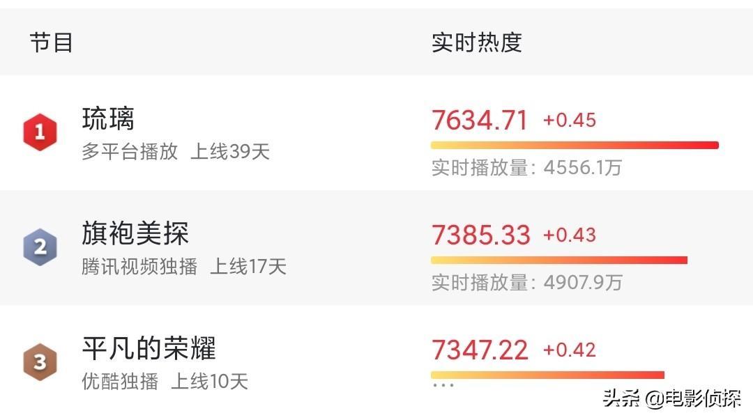 这两部剧分别是《旗袍美探》和《平凡的荣耀》,而这两部剧的全网热度分别位居二、三位。
