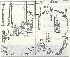 明代科学家宋应星写了一部图文并茂的科学巨著《天工开物》,其中第五卷专门叙述手工业制盐方法与程序。对于四川的井盐的采取,他说:“凡蜀中石山去河不远者,多可造井取盐。盐井周圆不过数寸,其上口一小盂覆之有余,深必十丈以外,乃得卤信,故造井功费甚难。其器冶铁锥,如碓嘴形,其尖使极刚利,向石山舂凿成孔。其身破竹缠绳,夹悬此锥。每舂深入数尺,则又以竹接其身,使引而长。初入丈许,或以足踏锥梢,如舂米形。太深则用手捧持顿下。所舂石成碎粉,随以长竹接引,悬铁盏挖之而上。大抵深者半载,浅者月余,乃得一井成就。”在多幅“作咸”图中,《蜀省井盐一》,是一幅凿井图,绘一人立于小河边,双手执“刺锥”,在地上凿小孔,那刺锥上为竹竿,下边很像现在的探铲。画的虽然是开凿四川盐井,但图中人物手持工具和洛阳铲的操作却是一模一样。井盐的生产起始很早,刺锥的发明与使用肯定早于明代。