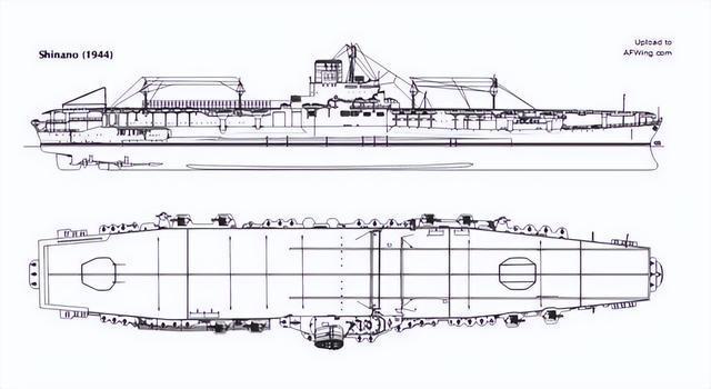 “信浓”号原本是大和级战列舰的3号舰,1号舰和2号舰于1937年动工,1941年下水服役,就是日本海军的“大和”号和“武藏”号战列舰。3号舰则被列入日本第四波海军舰艇建造计划,于1940年5月开始在横须贺海军造船厂6号船坞动工建造,曾一度停止,但1942年6月中途岛海战日军遭遇惨败,4艘航空母舰被击沉,航母力量大为减少,海军军令部遂决定将已经完工50%的战列舰“信浓”号改建成航空母舰。