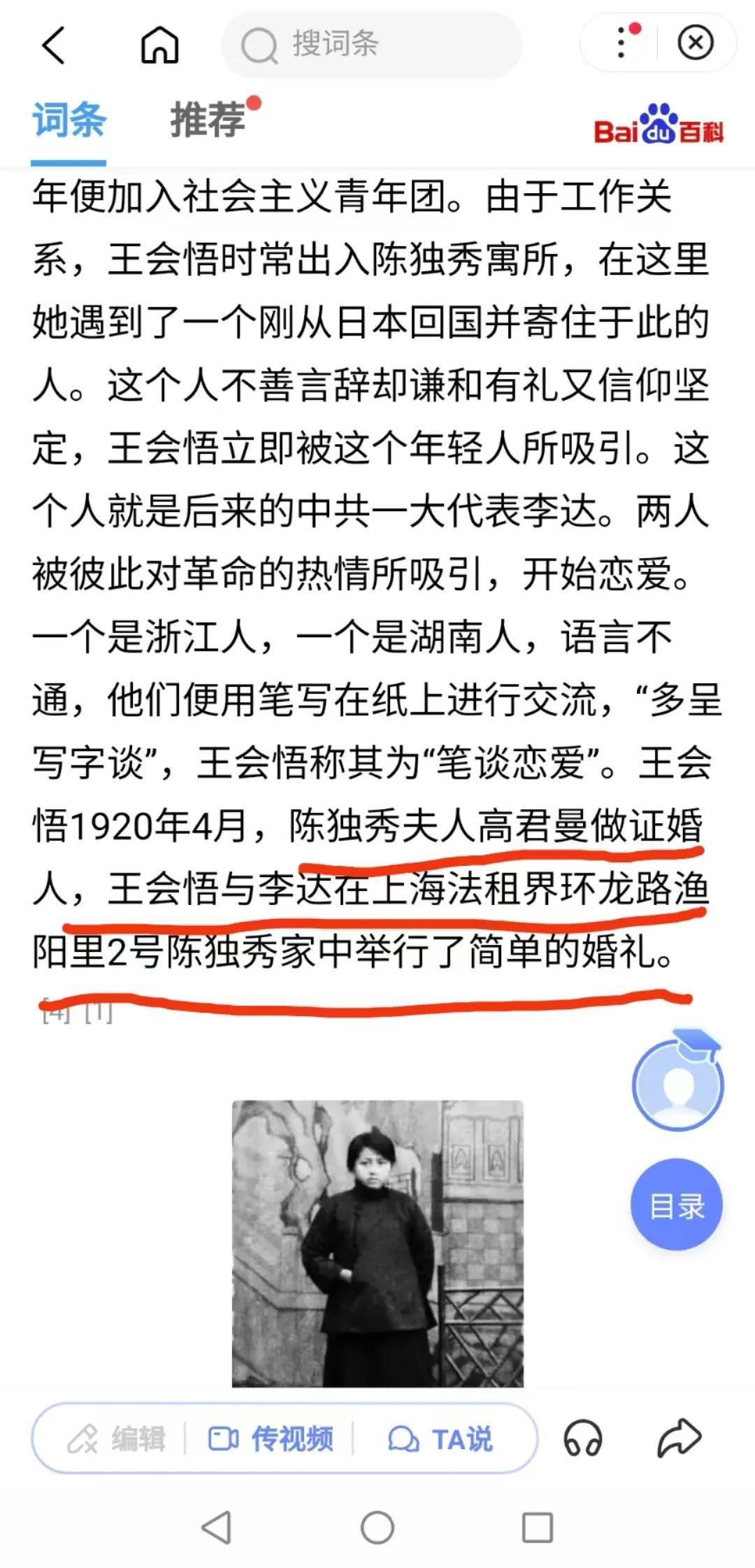 高君曼还是王会悟的证婚人,1920年4月,陈独秀夫人高君曼做证婚人,王会悟与李达在上海法租界环龙路渔阳里2号陈独秀家中举行了简单的婚礼。如图: