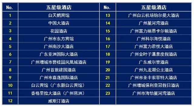 一个城市五星级酒店数量的多少,间接的反映了这个城市商务及旅游行业的发展水平。根据国家文化和旅游部五星级饭店名录,广州市共有23家五星级酒店,遗憾的在广东省内排名第二,当然在大湾区城市内也排名第二!