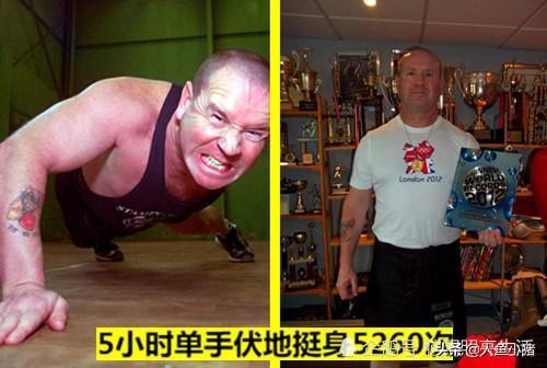 paddy doyle(帕迪·道尔)是世界健身耐力的冠军,他自己创下了多项世界纪录,当然,让人印象深刻的是他在5小时内完成的5260次单手伏地挺身的成绩,这听上去真的十分惊人,之所以paddy doyle能够有这样的耐力,主要还是和他的经历有关,据paddy doyle自己说,年轻的时候曾是英国伞兵一员,在部队艰苦的训练给了自己强健的体魄,目前paddy doyle已经取得了100多项世界纪录,但即使这样,他依旧不满足,并表示要继续创造更多的纪录!