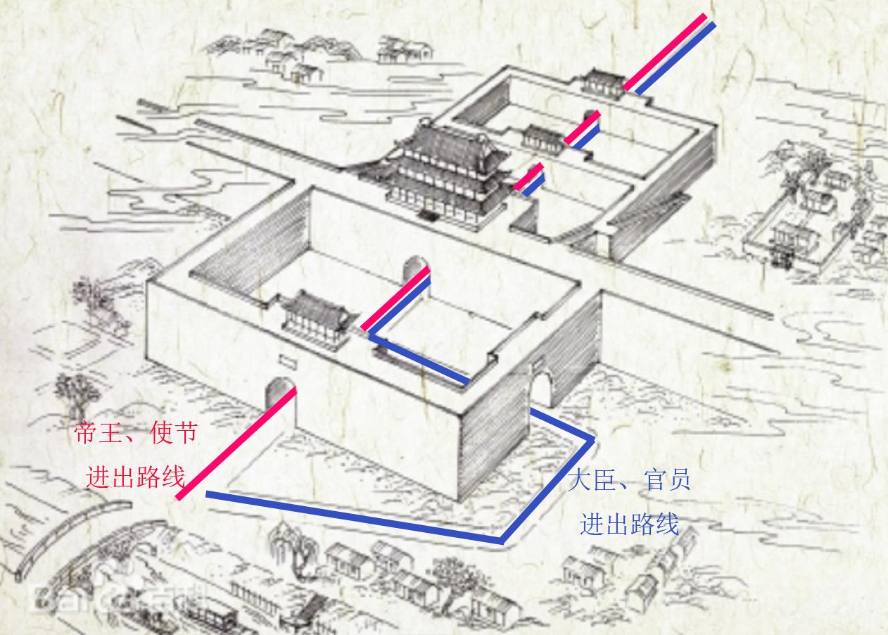 更为独特之处在于,外瓮城有南、东方向两道门,分别位于主城门的正前方和东侧方。外瓮城南门、主城门和两道内瓮城的门在紫禁城的中轴线上,为平时皇帝大典及外国使臣出入的线路;日常官员及大臣从外瓮城的东侧门进出。