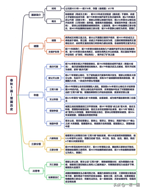 始祖姬虞(周成王之弟),前1033年成王封姬虞(唐叔虞)于唐地,叔虞之子夑继位后改为晋,前770年晋文侯护送平王东迁建东周,前678年曲沃武公代晋(宗族斗争),晋献公时期公族被灭殆尽,前636年晋文公继位后开启改革(三军刘卿)后称霸,随着南方楚国崛起,晋楚百年争霸(晋占优势),晋悼公后晋国朝政被卿族把持,公室衰落,前453年赵魏韩三家分智氏,前403年赵魏韩封诸侯三家分晋,前376年晋静公被贬为庶民,晋国亡