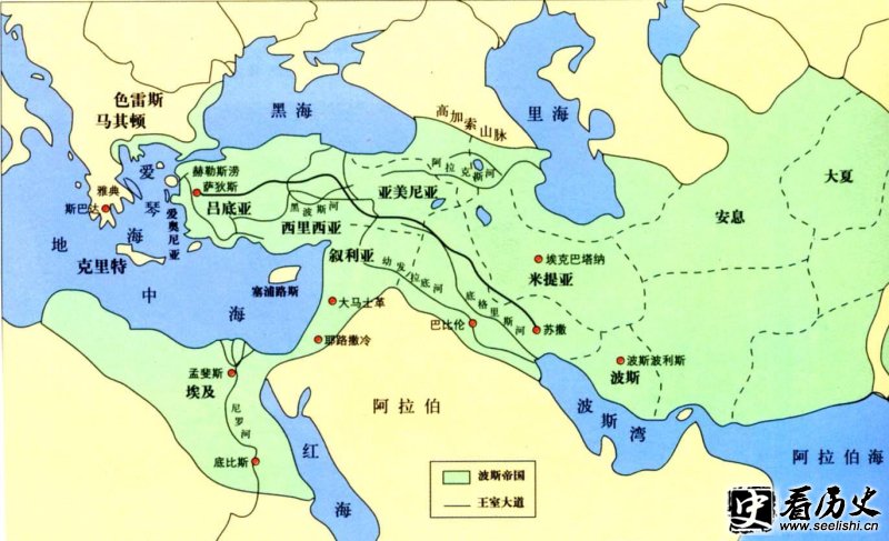公元前522年,祭司高墨达起兵反抗波斯,夺取了政权,并以免税三年和不服兵役为号召,一时波斯帝国境内被征服民族纷纷独立。高墨达起兵后,冈比西斯死于从埃及回国的途中。出身于阿黑门尼德氏族的大流士一世(公元前521——485)在波斯贵族的支持下,杀高墨达,夺得了政权。大流士一世即位后,残酷镇压了波斯帝国境内各被征服民族的反抗斗争,不仅恢复而且又扩大了帝国的疆土:东起印度河,西至小亚细亚沿岸,并曾一度占有欧洲的色雷斯部分地区,南有埃及,形成包括整个中近东地区的领土空前广阔的奴隶制大帝国。从大流士一世时起,帝国的首都共有四个:苏撒、爱克巴坦那、巴比伦、帕赛波里斯,波斯国王及其宫廷一年四季轮流驻跸于每个都城。