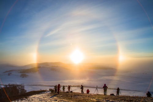 所以只有同时具备了风雪、薄云、和零下三十度以下气温的条件,才能出现这种阳光折射的大气层现象。