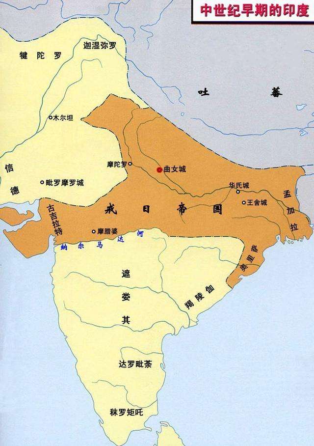 戒日帝国是从笈多分裂后的一个小邦中发展起来的。7世纪初,戒日帝国(606-647)兴起,哑哒人(嚈哒)被逐,戒日王统一了北印度,建都曲女城。其疆域东到孟加拉湾,西迄旁庶普的几乎涵盖了整个北印度。戒日王统治时正值玄奘访印,他对玄奘给予很好的礼遇。