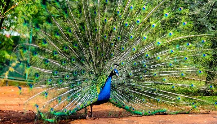 孔雀属于鸡形目雉科类,孔雀全长达2米以上,其中尾长约1.5米,为鸡形目体型最大者。头顶翠绿,羽冠蓝绿而呈尖形,栖息于森林的开阔地带,野生数量稀少,为中国国家一级保护动物。
