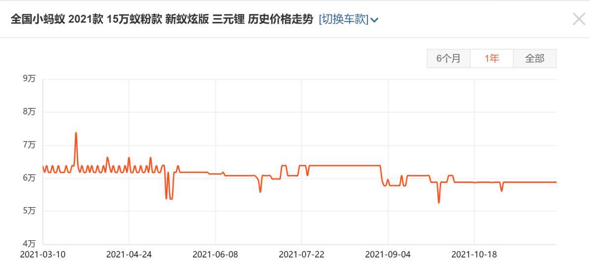 譬如最新的2022款小蚂蚁,产品力正盛,优惠力度就一般,而老款的2021款小蚂蚁,譬如2021款 20万蚁粉朝气版 磷酸铁锂301km在今年9月份就降至了3.86万元,优惠力度达2万多元。