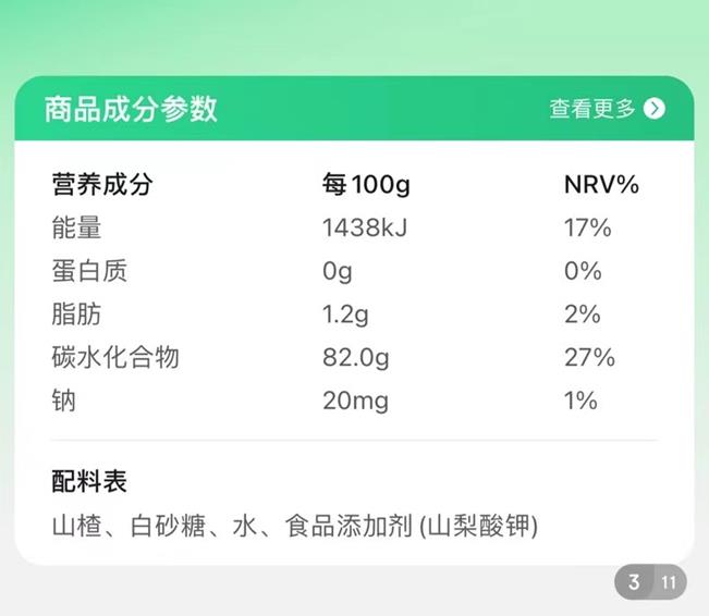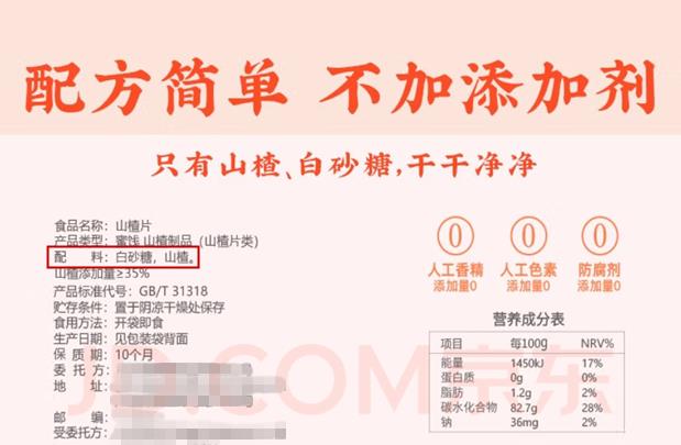 含糖量真的不少,我们可以从营养成分表推算下。也就意味着,每100克山楂片,白砂糖含量可高达57.6克,真的相当于娃吃下一口山楂片,半口都是白砂糖。