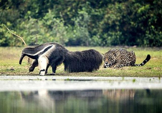 美洲豹在美洲草原上算不上第一,但是要称它为顶级猎食者应该不为过吧,被它盯上的猎物多半没有什么好果子吃,而食蚁兽却不一样了,如果是正面交锋的话,食蚁兽多半能够打赢猎豹。