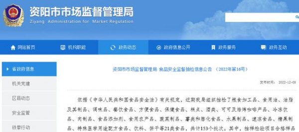 中国质量新闻网讯 2022年12月9日,四川省资阳市市场监督管理局网站发布食品安全监督抽检信息公告(2022年第16号)。