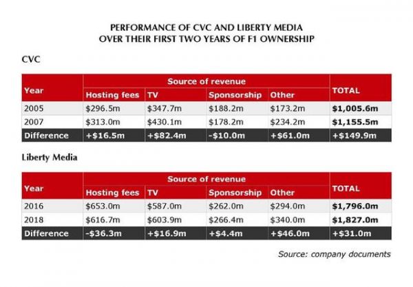 与之相对应的是,CVC在2006年收购63.4%的F1股份,尽管遭遇金融危机赛程缩水到17站,2007年F1的赛事收入依然能够增加1650万美元。