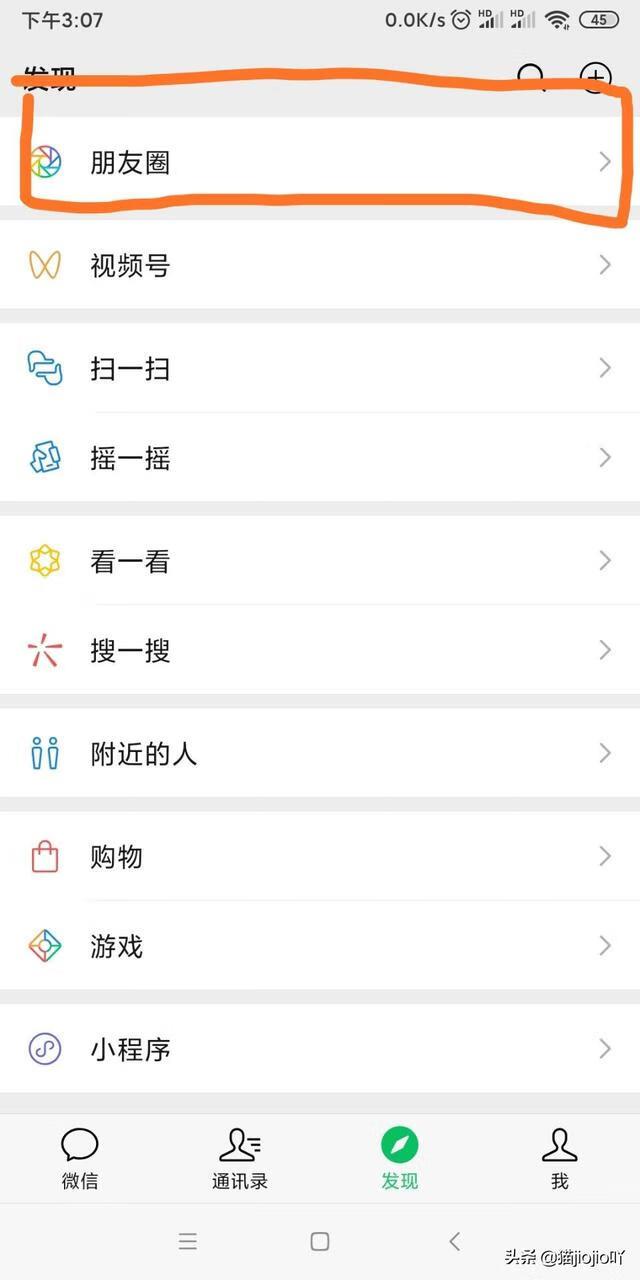 第一步,打开微信APP,点击右下方“发现”,可以看到正上方的“朋友圈”。