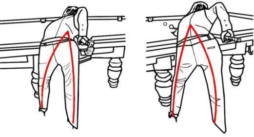 弯腰时重心前移很重要,同时腹部向前稍微越过腿和脚。如果杆的后把出杆时粘连,就会疵杆,击球也会缺乏力度。尽可能直的弯下身去,以对球势有全局的把握。轻轻向前伸出左臂和手,慢慢向后伸出虎口和右上臂。这有助于用身体进行协调,扭转肩膀,贴身运杆。如果合适,左臂应稍微弯曲放于球桌上。身体应贴着球桌保持平直,骨盆处弯曲,同时胸腹之间弯曲最小。