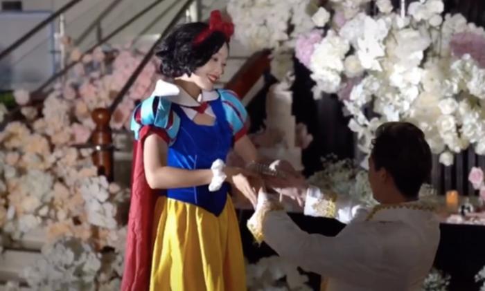 之后还在求婚现场上演了一出白雪公主和白马王子的舞台剧: