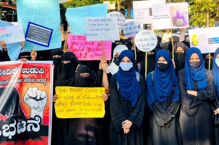 此后不久,一张学生们戴着头巾坐在课外台阶上的照片在社交媒体上疯传,当时,乌杜皮地区多所学校出台了头巾禁令,照片瞬间点燃了穆斯林群体的怒火。