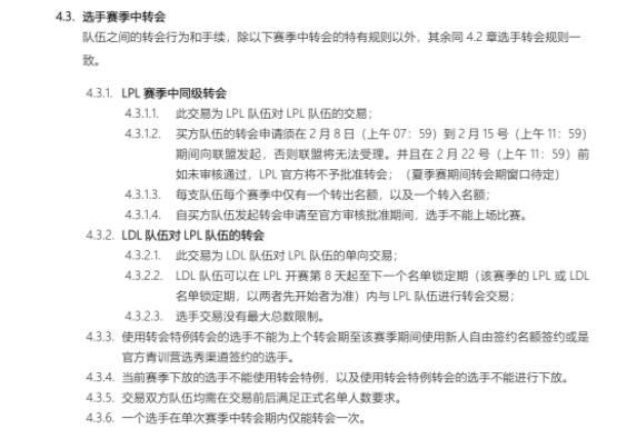 英雄联盟官方更新了新赛季LPL比赛规则,其中增加了赛季中转会:LPL赛季中同级转会买方队伍的转会申请须在2月8日到2月15号期间向联盟发起,否则联盟将无法受理。并且在2月22号(上午11:59)前如未审核通过,LPL官方将不予批准转会:(夏季赛期间转会期窗口待定)。每支队伍每个赛季中仅有一个转出名额,以及一个转入名额。自买方队伍发起转会申请至官方审核批准期间,选手不能上场比赛。LDL队伍对LPL队伍的转会此交易为LDL队伍对LPL队伍的单向交易,LDL队伍可以在LPL开赛第8天起至下一个名单锁定期(该赛季的LPL或LDL 名单锁定期,以两者先开始者为准)内与LPL队伍进行转会交易。选手交易没有最大总数限制。使用转会特例转会的选手不能为上个转会期至该赛季期间使用新人自由签约名额签约或是官方青训营选秀渠道签约的选手。当前赛季下放的选手不能使用转会特例,以及使用转会特例转会的选手不能进行下放。交易双方队伍均需在交易前后满足正式名单人数要求。一个选手在单次赛季中转会期内仅能转会一次