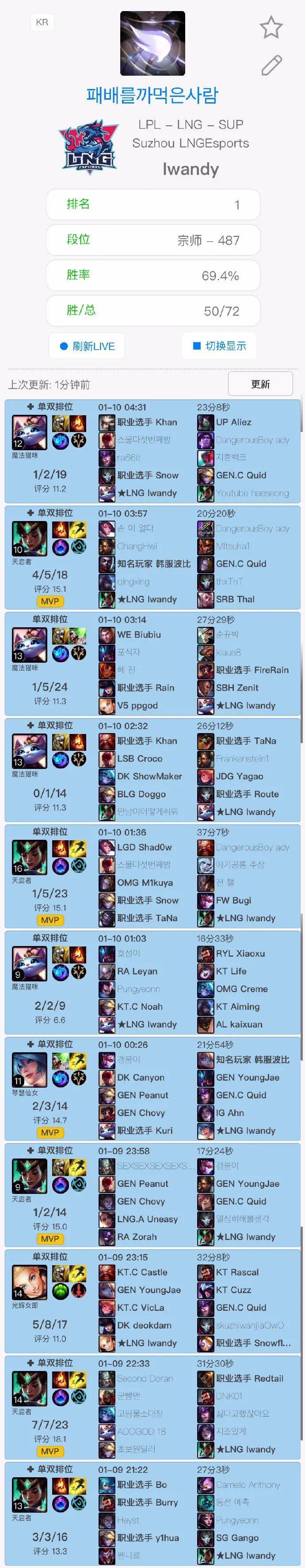 看完国服再来看韩服,LNG的Iwandy在昨日已经打上了韩服第一,并且是从前天晚上到昨天凌晨,一路11连胜上第一,同时Iwandy也成为今年第一位上韩服第一的LPL选手。