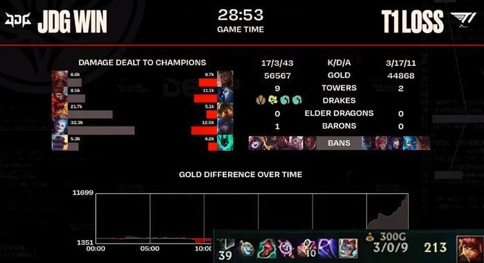 25分钟Knight安妮找机会秒掉锤石,Faker泰坦空钩导致T1无法及时撤退,JDG金克丝再度触发罪恶快感连杀四人,再拿水龙魂和大龙。决战时刻JDG战队冲上高地乱杀,轻松虐菜团灭对手,顺利赢下本场BO5的第一分!