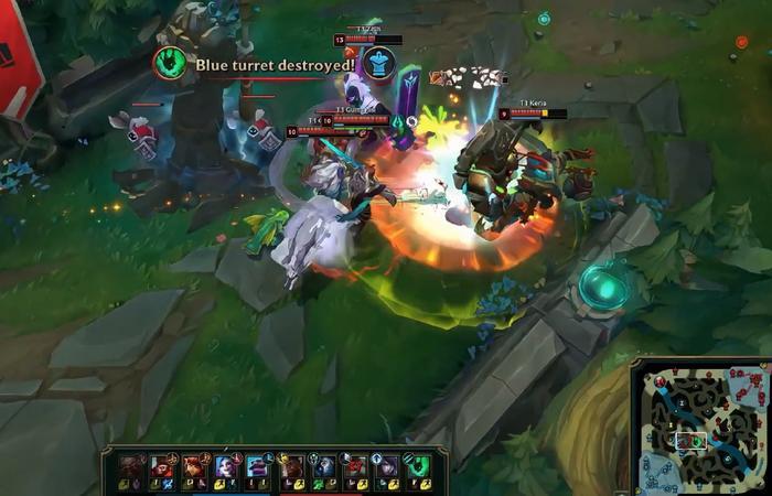 开局T1千珏在中路没有线权的情况下入侵野区,但他打着打着急了,强行闪现追击猴子,却因草丛丢失视野而打不出三环,反而送出一血。不过T1下路换线拿先锋,帮千珏越塔杀酒桶,经济方面还是领先的。