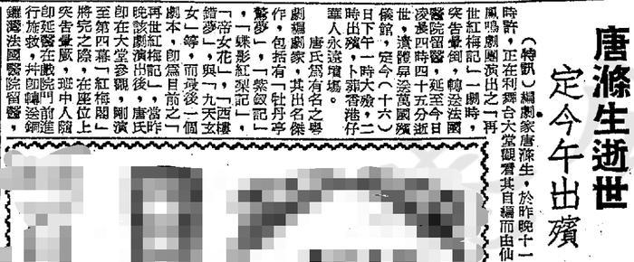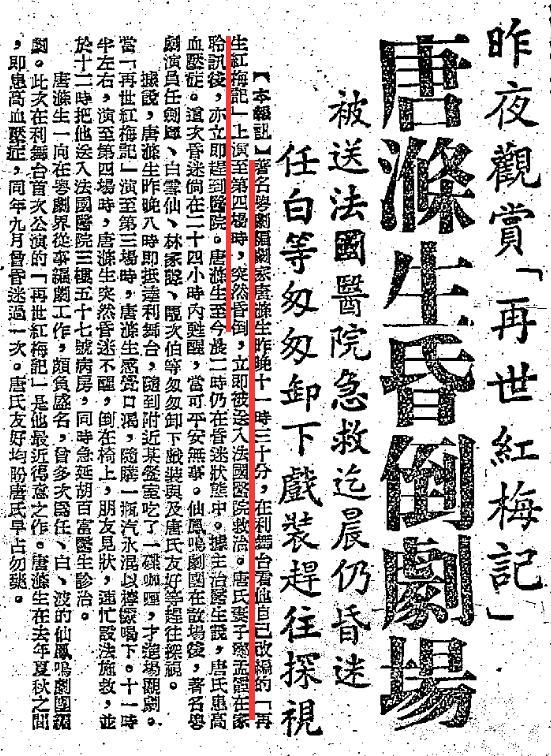1959年9月14日晚,唐涤生改编的新作《再世红梅记》在利舞台戏院首演,结果看到第四场的时候,他突然昏倒,被送去医院急救。