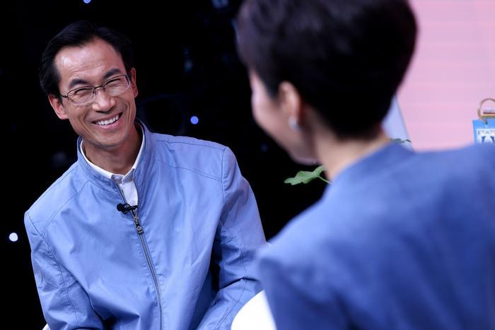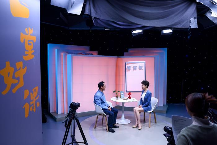 4月12日,在中国教育电视台一处演播室,朱彦军(左)受邀参加《育见》栏目关于“世界读书日”系列访谈的录制。新华社记者 刘金海 摄
