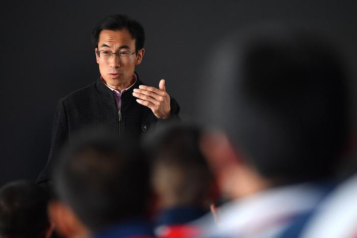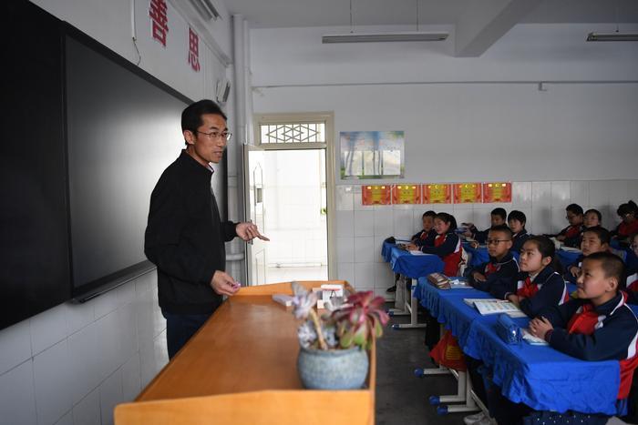 朱彦军在静宁县城关小学与孩子们交流诗词和阅读心得(4月10日摄)。新华社记者 陈斌 摄