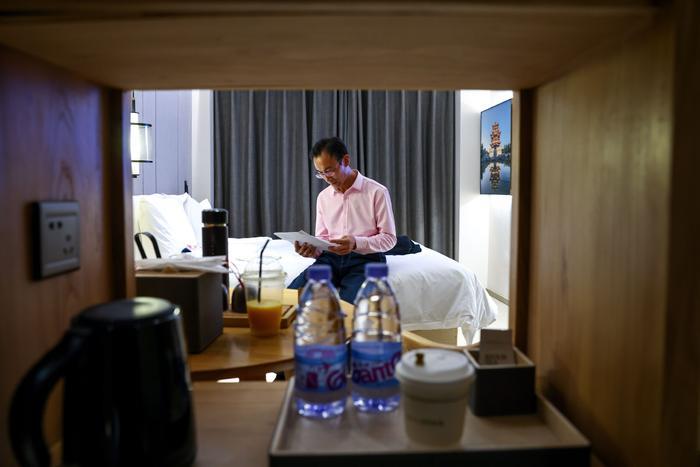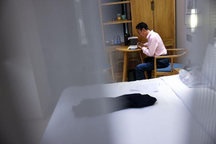4月11日,朱彦军在北京一家宾馆浏览参加节目录制的受访提纲。第二天,他将受邀参加中国教育电视台《育见》栏目关于“世界读书日”系列访谈的录制。新华社记者 刘金海 摄