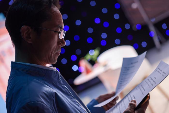4月12日,在中国教育电视台一处演播室,朱彦军在节目录制前进行最后的准备。新华社记者 刘金海 摄