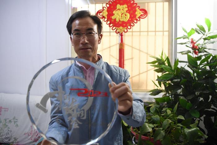 朱彦军在家中展示自己获得的《2023中国诗词大会》亚军奖牌(4月10日摄)。新华社记者 方欣 摄