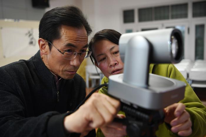 朱彦军和同事在静宁县文化馆调试设备,为“世界读书日”活动做准备(4月10日摄)。新华社记者 方欣 摄