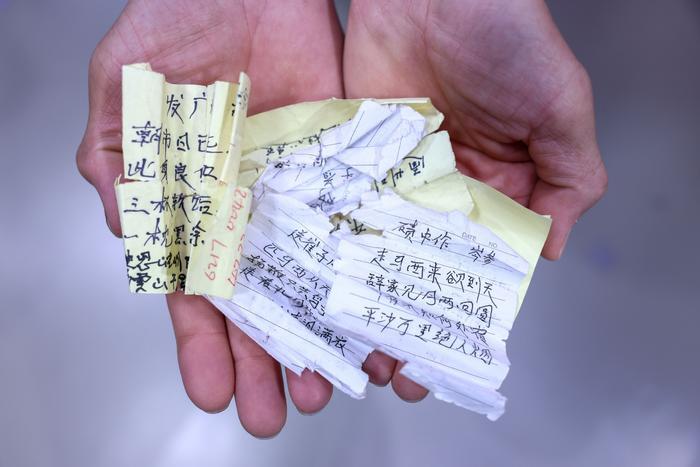 朱彦军展示自己为了背诵诗词抄录的便签(4月12日摄)。新华社记者 刘金海 摄