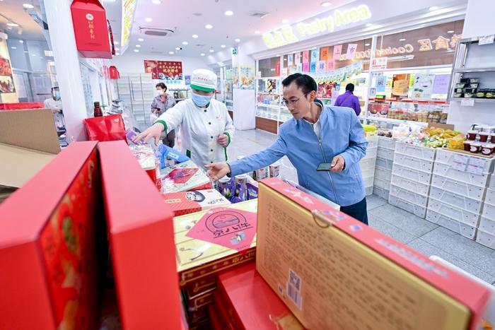 4月12日,朱彦军吃完午饭,抽空来到宾馆附近的一处北京稻香村门店,购买礼品糕点。他说,来趟北京不容易,要给老家的同事们带点北京特产。新华社记者 刘金海 摄
