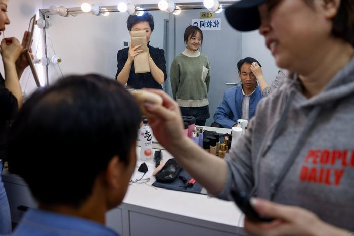 4月12日,在中国教育电视台一处化妆间,化妆师为朱彦军(右二)化妆。“头发有点长,得整整”,朱彦军憨厚地说。新华社记者 刘金海 摄