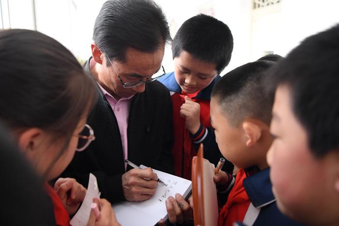 在静宁县城关小学,朱彦军在孩子们的笔记本上书写诗词,鼓励孩子们热爱阅读(4月10日摄)。新华社记者 陈斌 摄