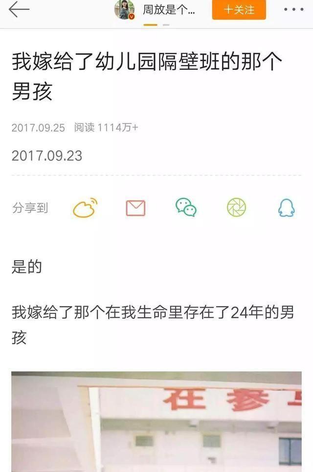 2017年,周放在微博写了千字长文官宣她与老公结婚的消息,同时也分享了他们是如何相识相恋相守,时至今日这篇以《我嫁给了幼儿园隔壁班的那个男孩》为题的爱的宣言,已有千多万阅读,这份美好与感动被千万人赞。