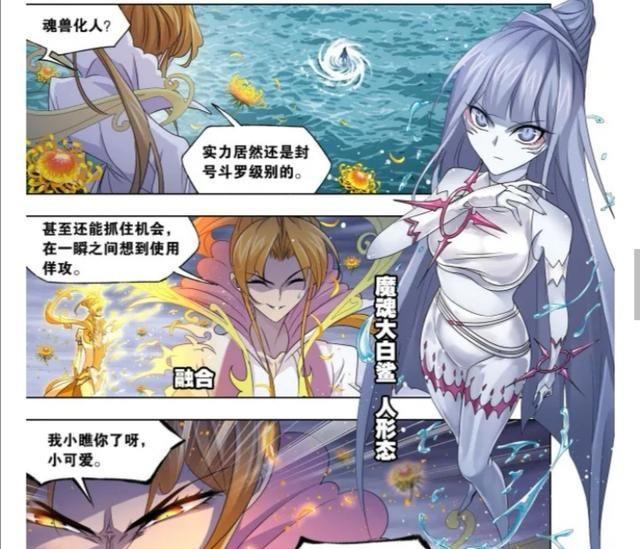 在与菊斗罗交手的过程中,魔魂大白鲨最初也是保持着魂兽形态,对菊斗罗造成了不小的伤害,而菊斗罗则是看中了魔魂大白鲨体型庞大的弱点,面对密集攻击,应该不好闪避。所以受伤之后的菊斗罗,他的攻击也改变了,然而让菊斗罗想不到的是,自己发动的圣光之门依旧被魔魂大白鲨轻松地躲了过去,因为此时的魔魂大白鲨,不再是魂兽形态,而是变成了一个美女角色。