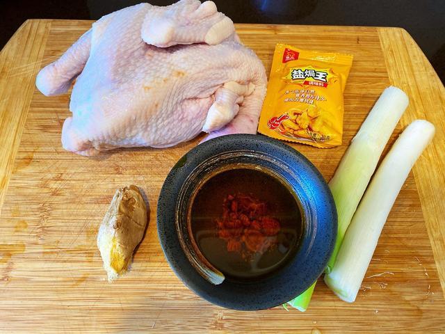 【所需食材】:鲜鸡1只、盐焗粉适量、生姜5片、大葱一根、栀子1个
