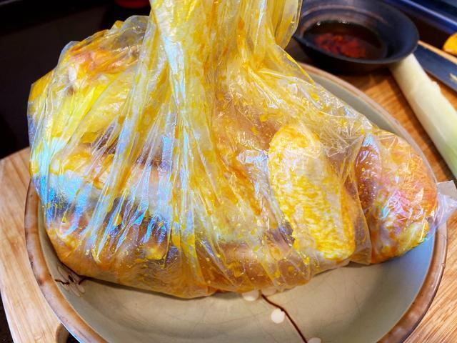 4. 抓拌均匀之后我们就可以看见塑料袋已经变成黄色了,用塑料袋来腌制,也是为了防止盘子和生手变黄,我们在腌制鸡肉的时候就可以隔着塑料袋涂抹均匀了 ,然后将袋子拧一下放在一旁腌制1个小时以上的时间。