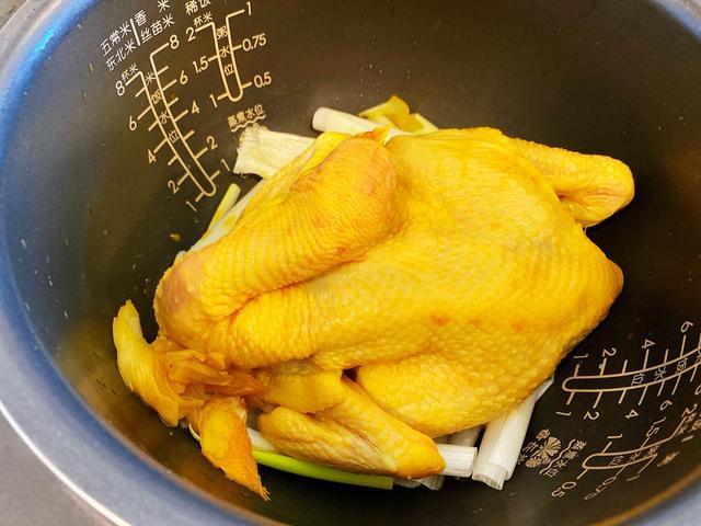 5. 腌制好之后就可以取出我们的电饭煲了,先在电饭煲内胆的底部铺上准备好的生姜和葱段,把腌制好的鸡也放进电饭煲的里面,盖上盖子选择煮饭的功能就可以了,也不用在里面放水,因为鸡肉在烹饪的过程中会有油脂分泌出来,也不用担心糊锅的问题了,这样的味道也会更浓厚一些。