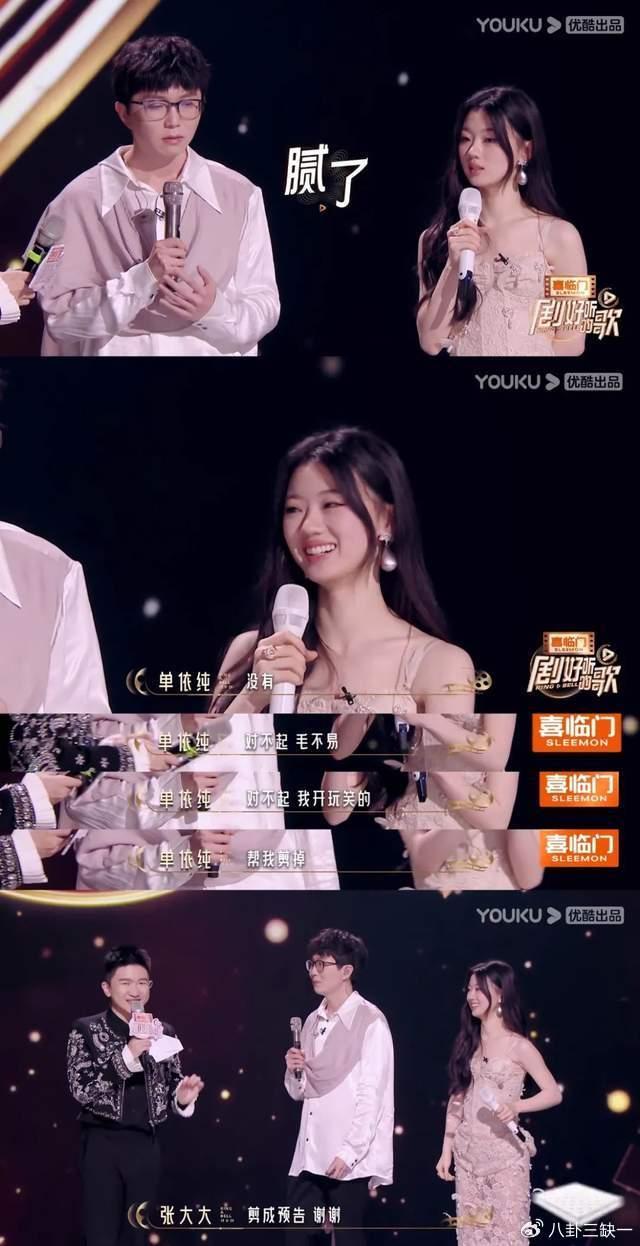 当时胡夏在台上清唱了一段《知否知否》,别的嘉宾都鼓掌夸好听,一转头就看单依纯一个人在那呲着牙嘎嘎乐地模仿萧敬腾唱这首歌的爆笑名场面,还问旁边的毛不易听没听过。