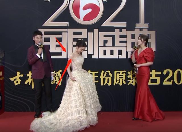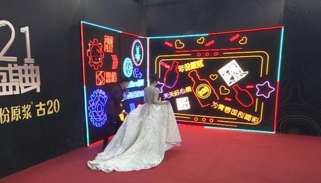 超大超长的裙摆让她行走不便,引得男主持人连忙跑过去帮忙。