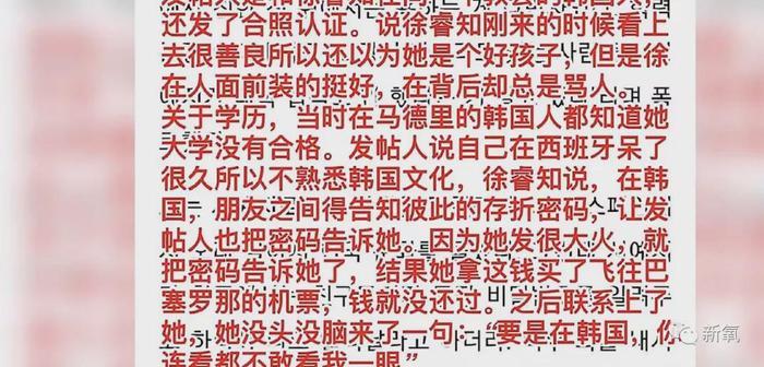 更有当时在西班牙的朋友,说徐睿知骗钱买机票不还,过后就联系不上跑路了。
