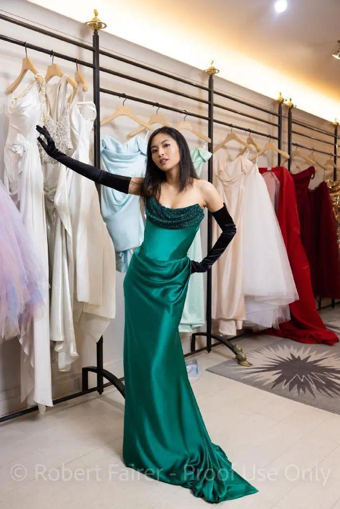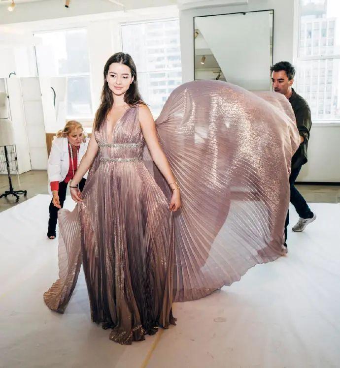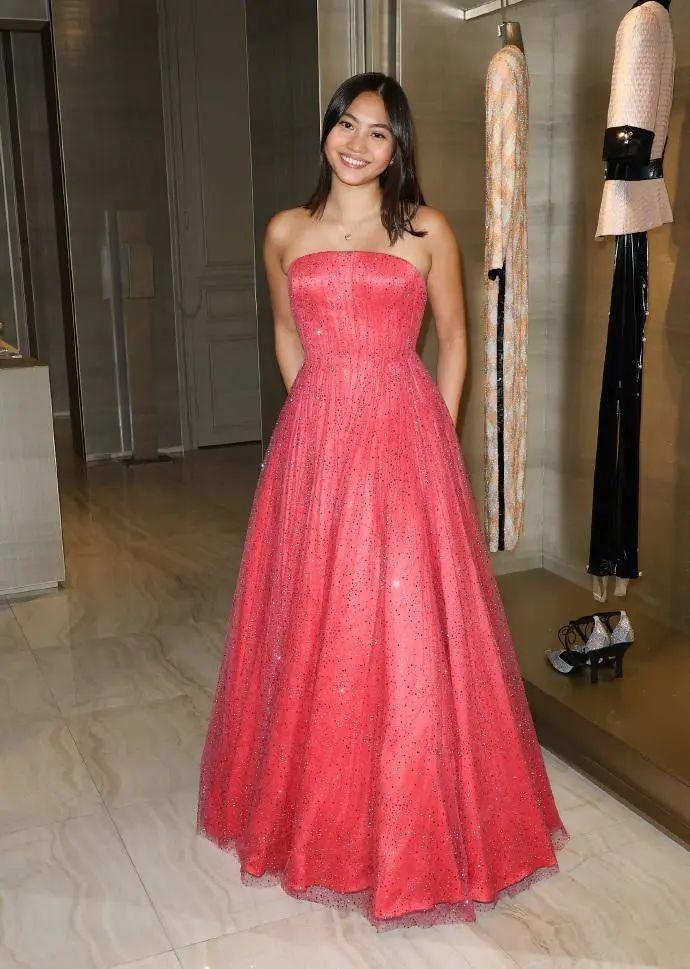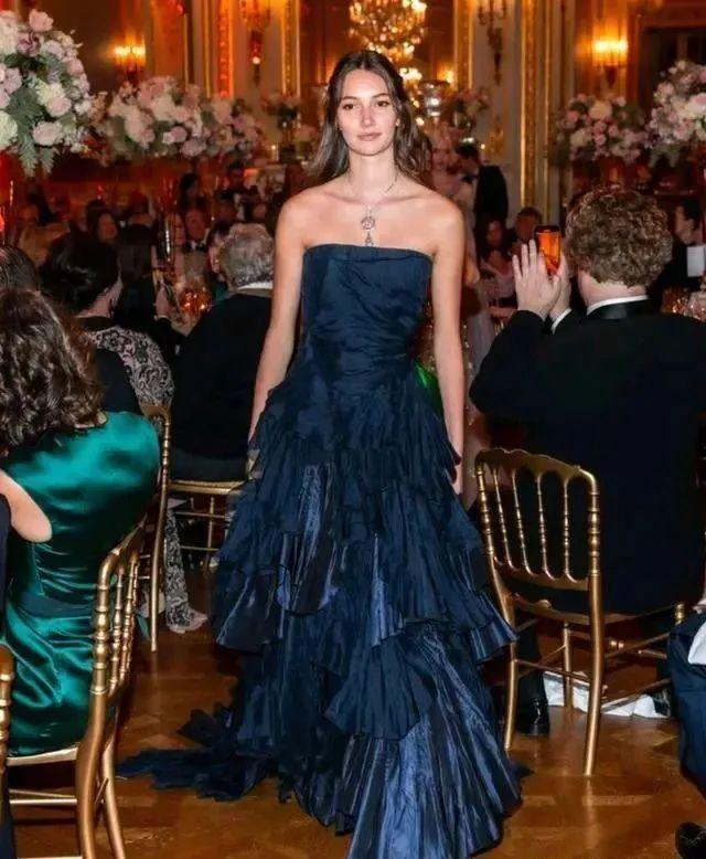 比如:张艺谋儿子的舞伴路易莎·杜布,她是乔治华盛顿大学的在读学生,当晚她身穿一条藏蓝色抹胸晚礼裙,这条裙子的裙摆由两种布料缝制而成,一种是哑光藏蓝,另一种则是会反光的藏蓝色布料,两种布料混搭,打造出很强的层次感。而这条苏雅的裙子穿在路易莎·杜布身上,衬托得她格外的高贵典雅。