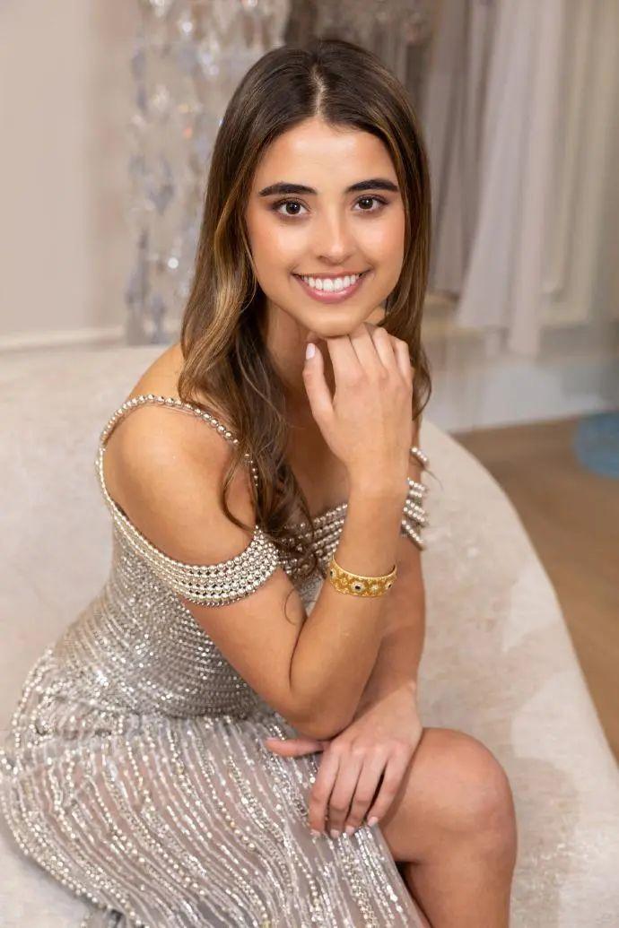 Hannah Husain在舞会上身穿一件纯白色晚礼服,十分的清新自然,脖子上戴了双层祖母绿钻石项链,高贵又稳重,在大合照时更是占据了第一排的C位,可见她身份之尊贵。